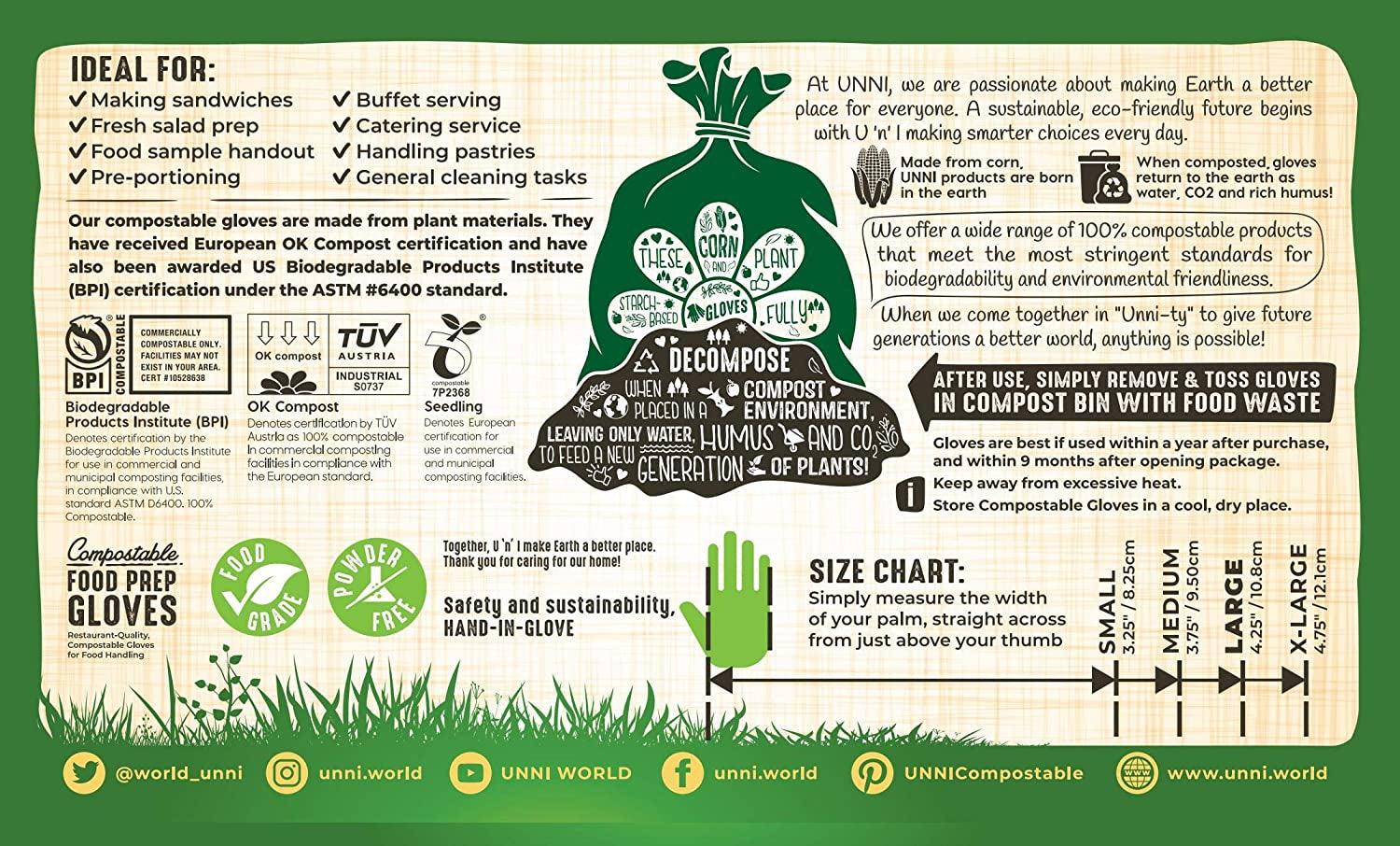 100% Compostable Food Prep Gloves. Restaurant-Quality.For Food Handling. Powder-Free. 100 Count. Medium. Earth Friendly Highest ASTM D6400. US BPI and Europe OK Compost Certified. San Francisco