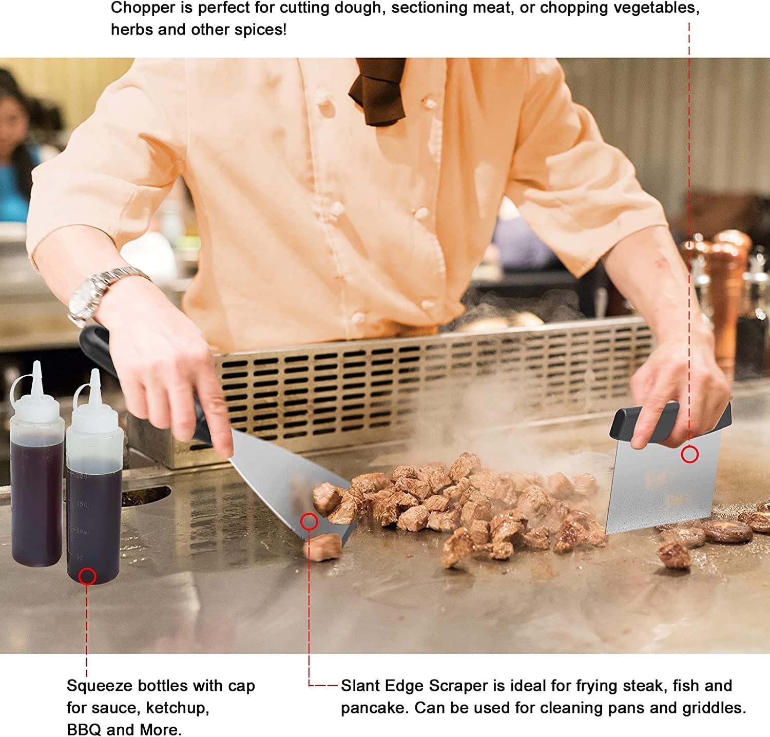 - [Must have griddle tools ] Our grill tools set with Scraper.spatulas and oil bottles are necessary griddle tools for Blackstone griddle. These griddle utensils set will allow you complete all the griddle applications. Great for flipping burgers. pancakes. veggies. cutting bread.meat and sausage. perfect to scraper griddle clean. Egg rings and pepper shakers to enhance your griddle cooking experience.Everything make your griddle work becomes more simple.