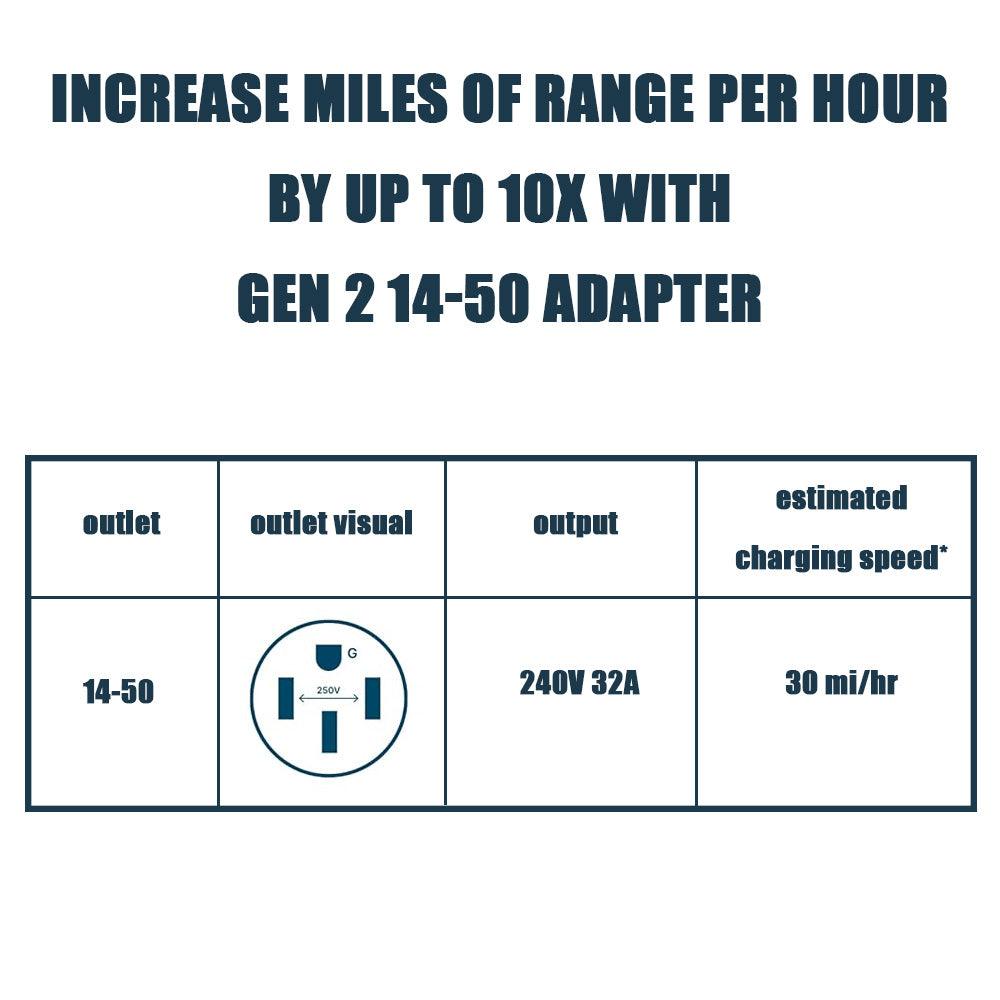 Applying the highest quality materials to practical designs. our products are engineered to meet the specific needs of EV vehicles and owners. Our EV charging products and accessories are backed by our industry-leading warranty with USA based support. Rated 240V at 32 Amps for faster and more efficient charging by connecting the 14-50 Adapter to the Tesla Gen 2 Mobile Connector Charger. If you have a 14-50 receptacle at home. work. or any destination. increase your miles of range per hour of charging by up to 10x (results may vary depending on your Tesla model). ETL Tested and Listed (Control No. 5026085) to conform to UL Standard 817. Certified to CSA Std. C22.2 No.21. SAFETY FEATURE: Integrated thermal sensor for auto-shutoff at max operating temperature of 122F.