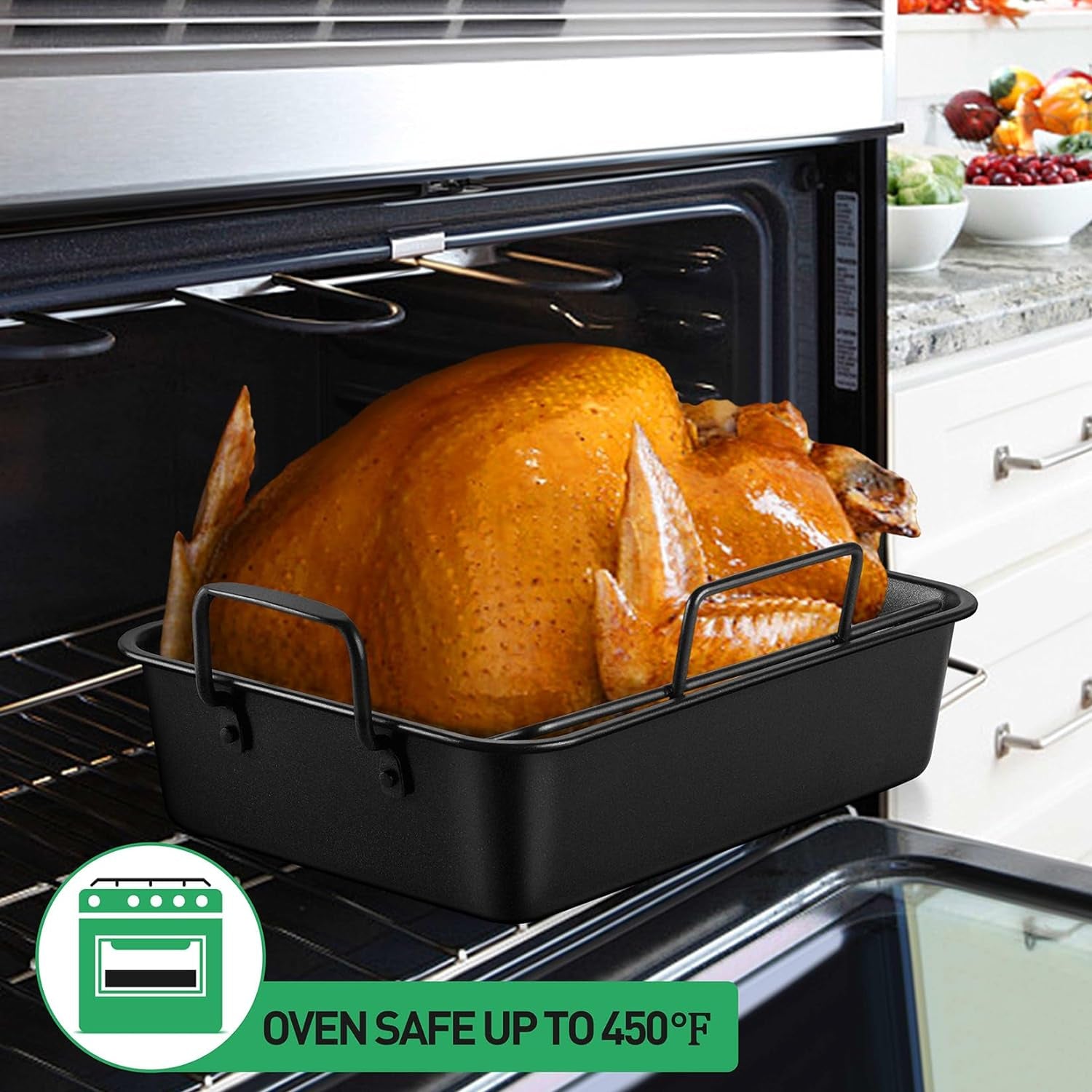 14 Inch Roasting Pan with Rack Set. P&P CHEF Turkey Roaster Pan & V-Shape Baking Rack & Cooling Rack for Chicken Vegetable Lasagna Cookie. Nonstick Coating & Stainless Steel Core. Sturdy & Healthy