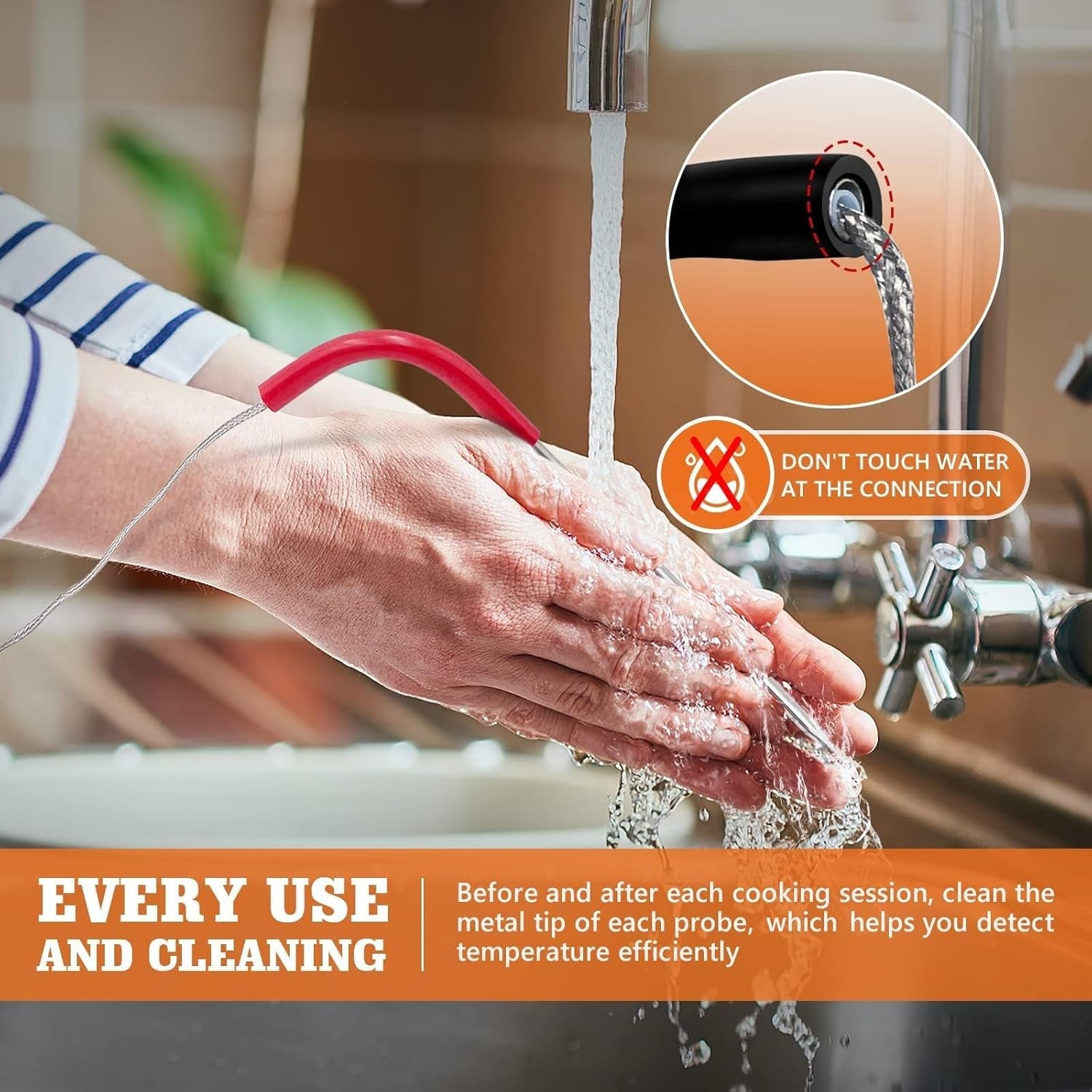 - EASY TO CLEAN AND USE: 3.5 mm plug-in meat probe. plug and play. The waterproof temperature meat probe tip is washable with water. helping to measure meat temperature more accurately each time. Plug and cable are not water washable