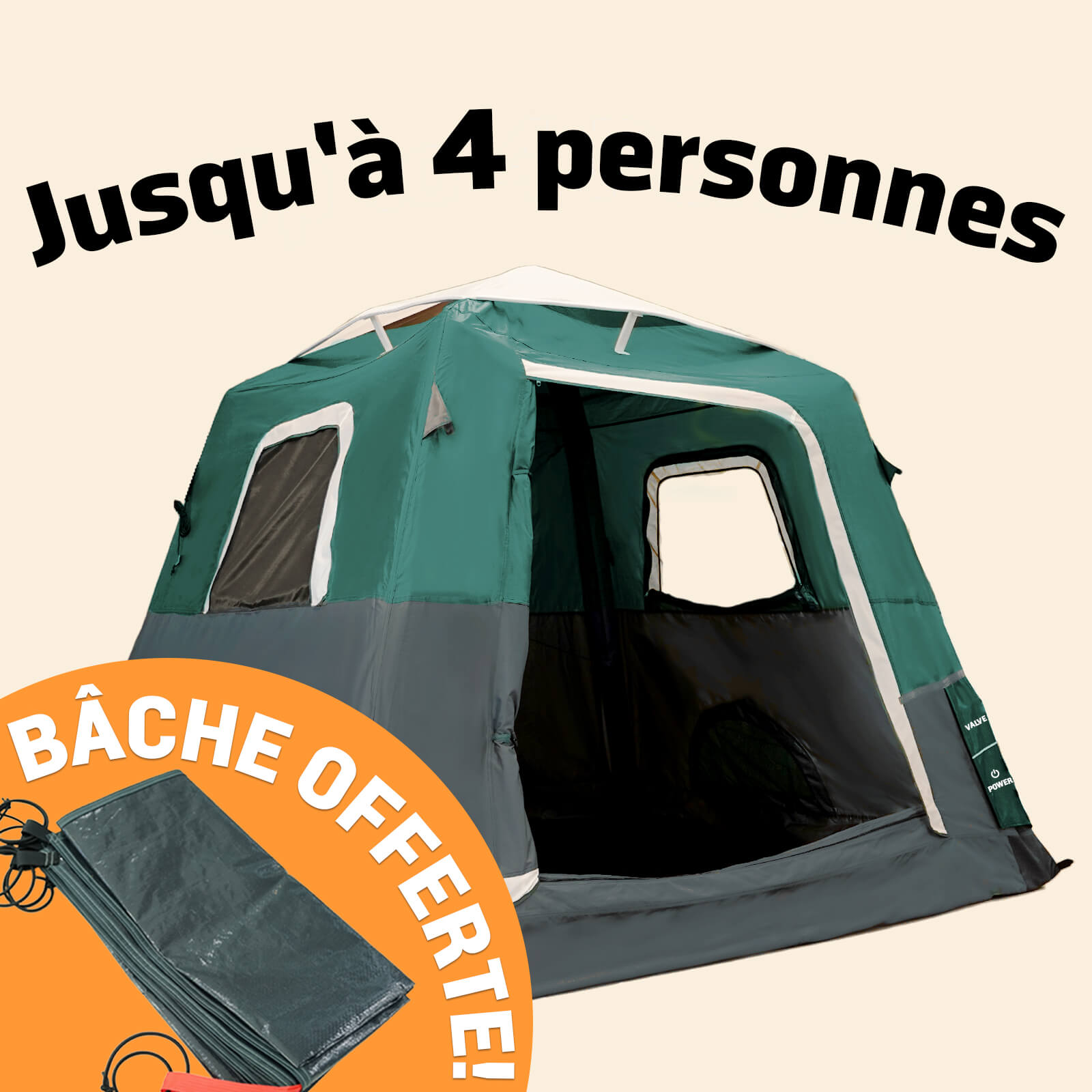2-Step Cabin Tent – Petite taille + Bâche de camping OFFERTE (jusqu'à 4 personnes. FR)
