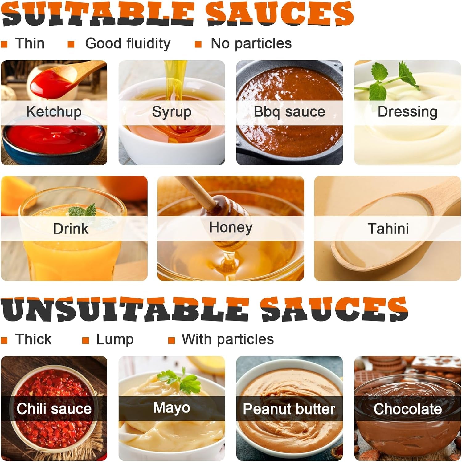 - 【Suitable sauces】The sauce dispenser pump can be a great tool to hold and dispense thin sauces without big particles. Such as ketchup. syrup. bbq sauce. salad dressing. soy sauce. tahini etc..