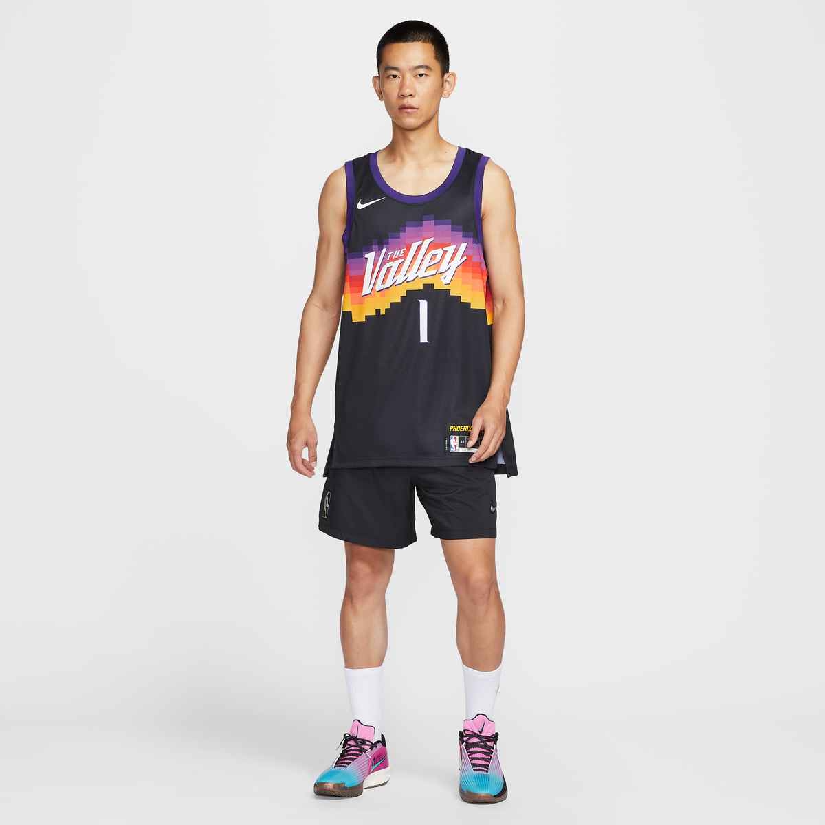 The Phoenix Suns' iconic Valley uniform returns in its original form for the 2025-26 season. celebrating the bold identity that first captivated fans in 2020. Created to reflect the vibrant desert landscape at sunrise and sunset. the Phoenix Suns' 2025-26 City Edition jersey features the unmistakable pixelated gradient in the silhouette of Camelback Mountain and The Valley wordmark across the chest. paying homage to the city. the culture. and the unwavering pride of Suns fans across Arizona. This fan-favorite look remains a symbol of the team's energy. resilience. and deep connection to the Valley.