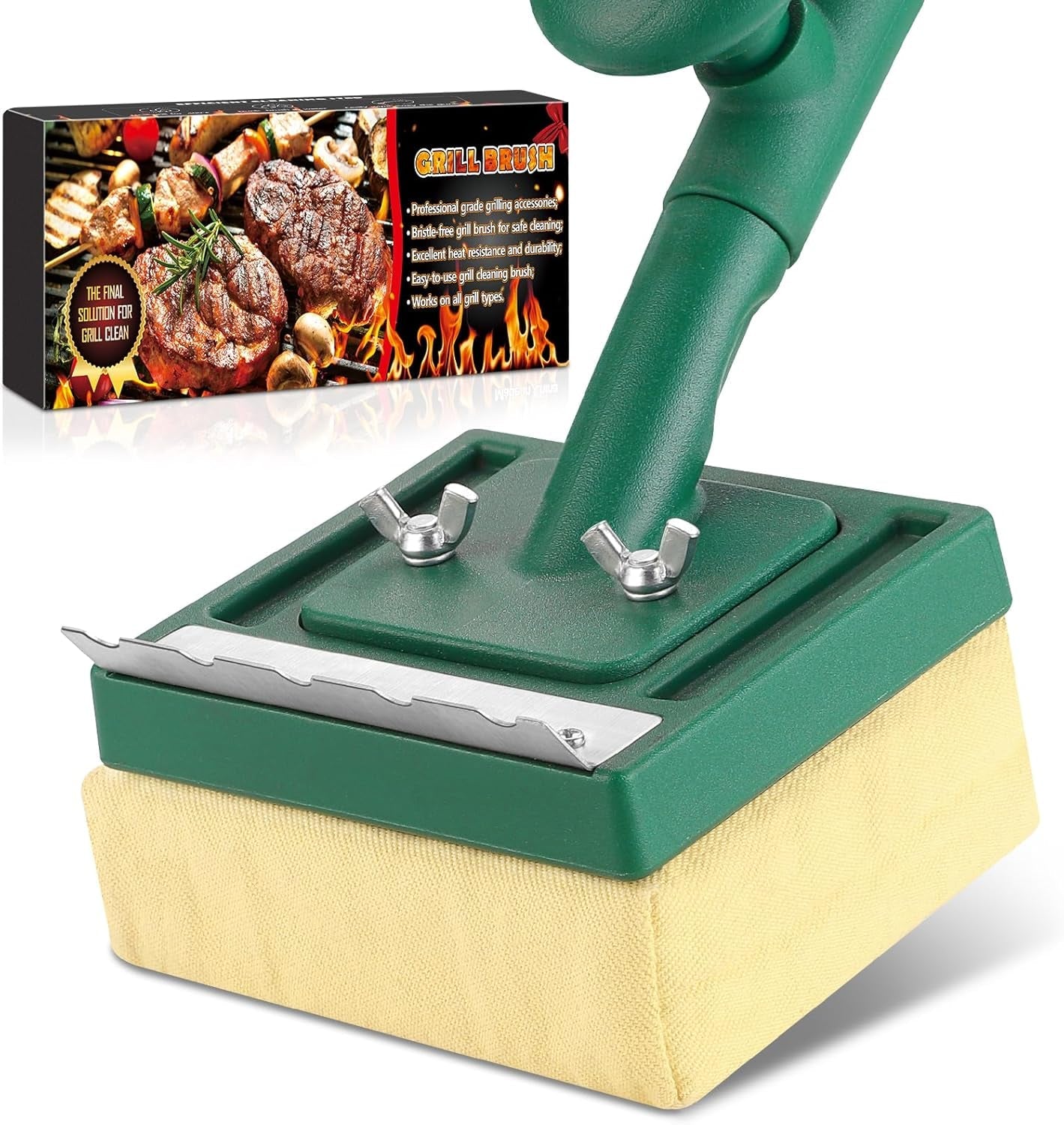 - [Safe & High-quality BBQ Accessories] Our grill brush bristle free with scraper is made of upgraded materials and uses steam power to quickly dissolve stubborn grease.no need to worry about shedding wires or burrs.Safe and efficient. it has six secure screws to keep the brush head in place and a detachable design for easy storage.making outdoor BBQ more enjoyable.