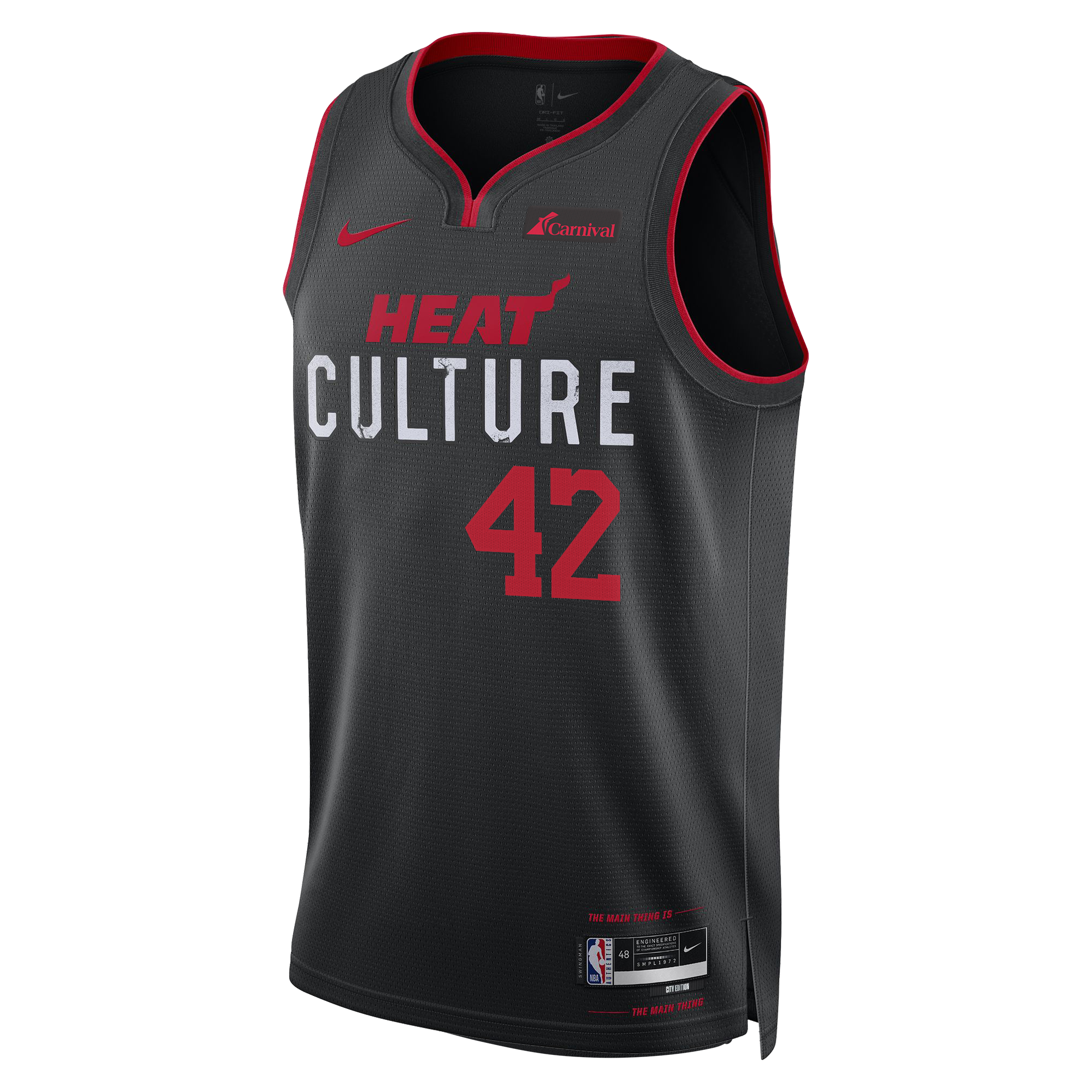 A black-colored base allows key ethos-inspired elements to shine. starting with the jersey's namesake: the HEAT Culture wordmark. featuring the team's standard HEAT stacked atop its weathered. war-torn Culture emblem. in use since 2016.