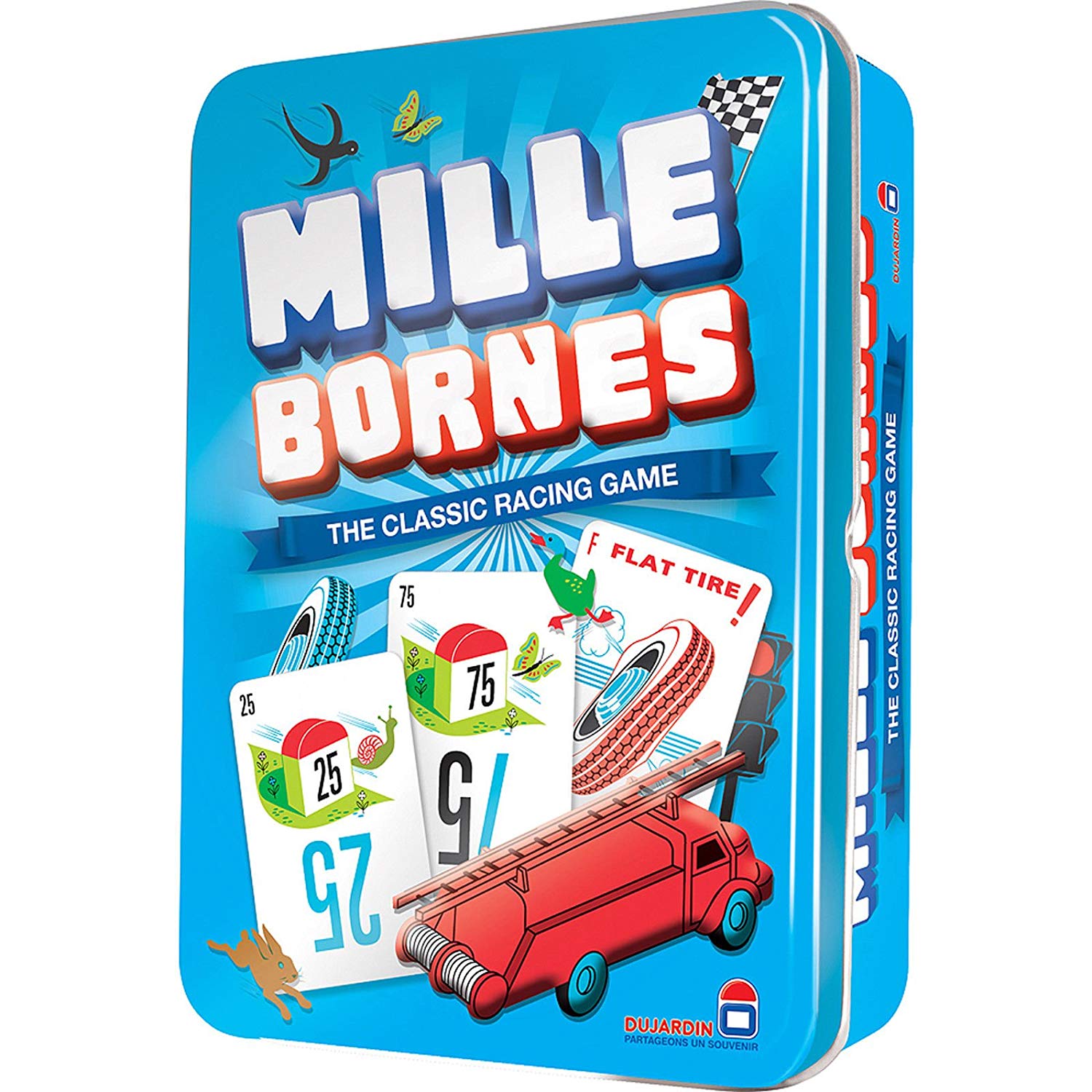 Rev the engine eagerly. waiting for the green light to send you hurtling across the countryside. Keep the tank full. find your way around the speed limit and avoid the accidents that will slow you down. Keep the pressure on full and be the first to make it 1.000 miles! Mille Bornes is the classic card game of cross - country racing. Keep a green light handy in case you get stopped and play a tire puncture on your opponent to keep him from getting ahead. Protect yourself with safety cards and save one for the classic Coup Fourre. Play your cards right and you'll be the first to cross the finish line and be the master of the Mille Bornes!.
