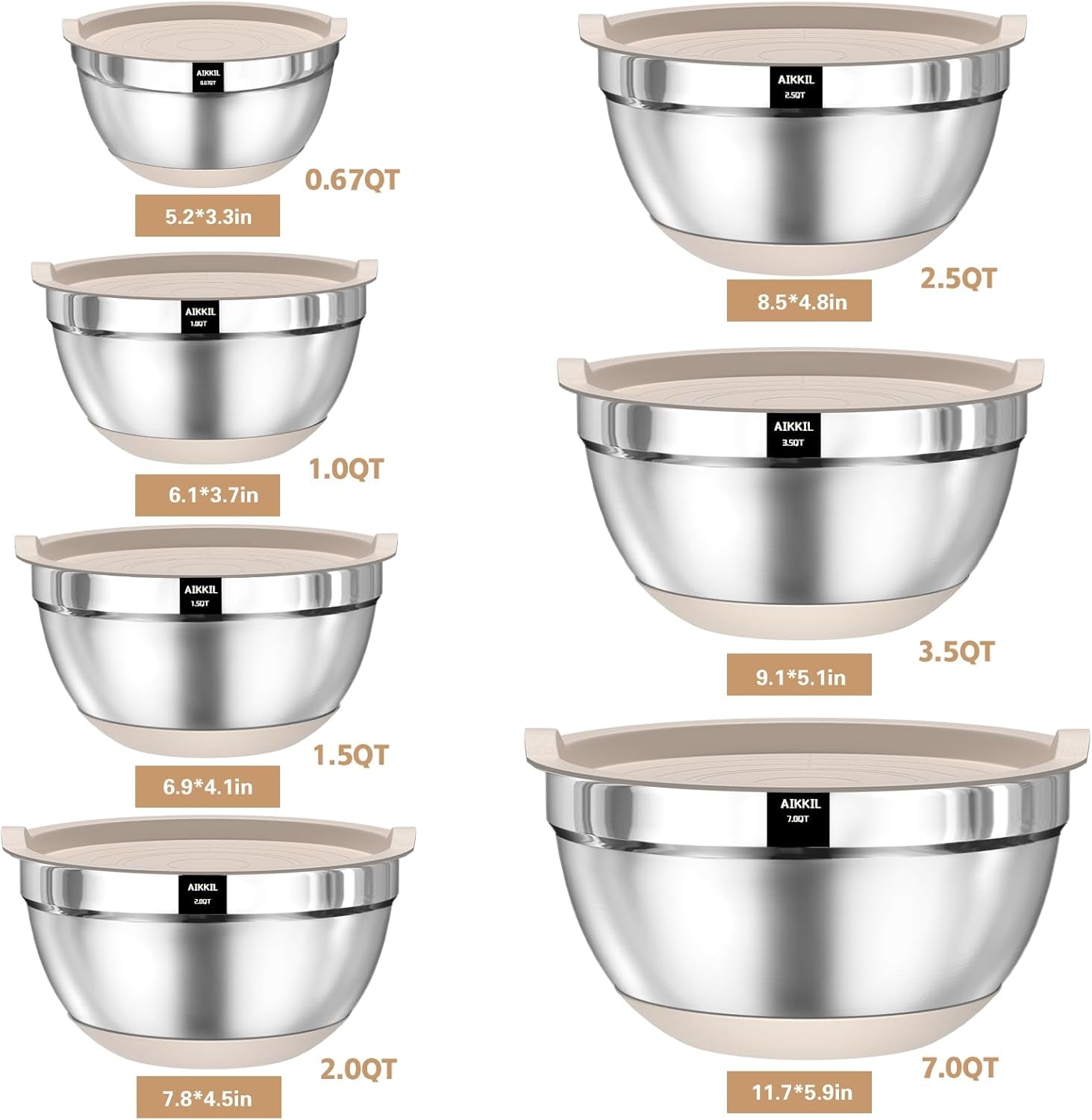 - Extra Value Accessories & 7 Sizes Nesting Bowls Set: Super versatile combination set including 6 size mixing bowls0.67. 1. 1.5. 2. 2.5. 3.5. 7 quart. meet your various kinds of kitchen needs. comes with basting brush. spreader spatula. flexible spatula. egg whisk. egg separator and 6 measuring spoons for better helping you cook more easily