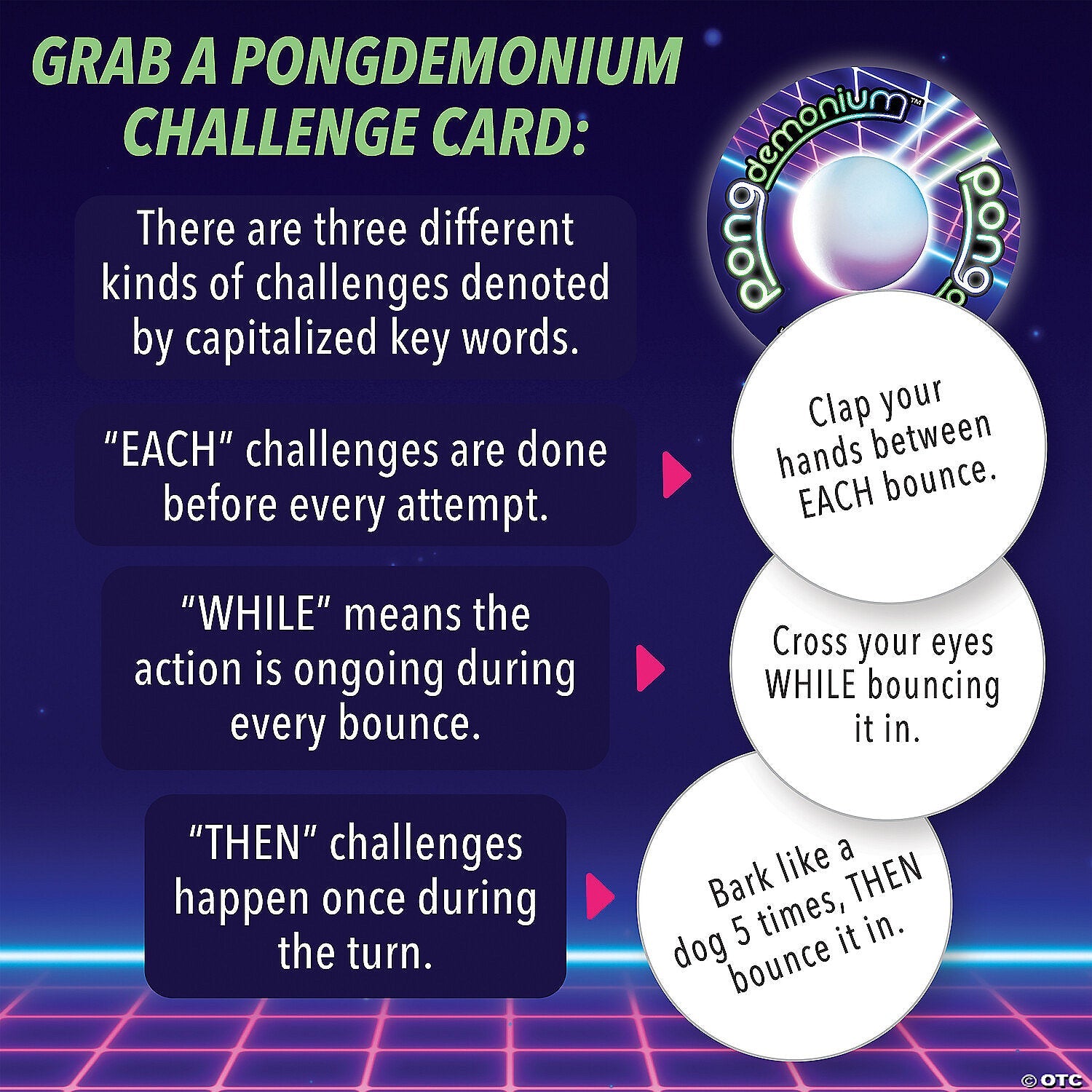 Get ready to laugh. bounce. and race the clock with Pongdemonium—the ultimate mash-up of silly challenges. fast reflexes. and high-energy action! Players take turns tackling wild tasks from the challenge cards—think hopping. spinning. or showing off your best dance moves—then aim to bounce a ball into the Ponger. Here's the twist: as soon as you finish your turn. flip the Ponger to start the built-in timer for the next player. The clock is ticking. the pressure is on. and the chaos is contagious!