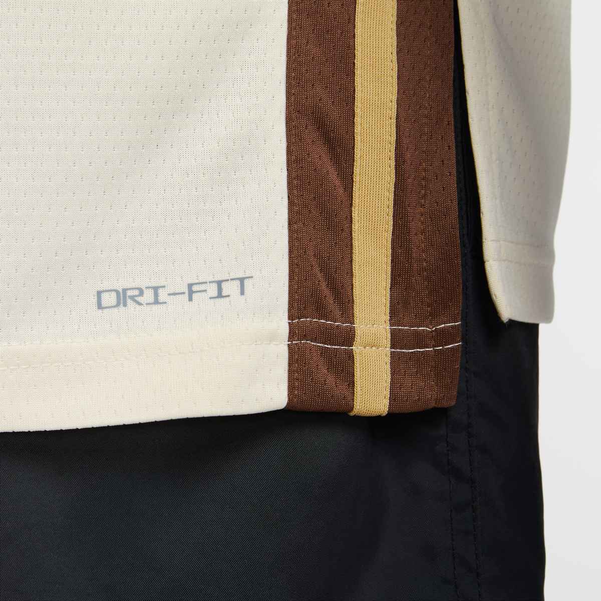 The 2025-2026 Golden State Warriors City Edition Jersey (originally released in 2019-20 in a different colourway) honors The Town and its rightful place in team lore. A fresh cream base signifies the team's strength and intensity. The tone-on-tone modern design features a rich dark brown. natural cream. and a touch of gold. The intentional color palette embodies the pride. grit. strength. and enduring legacy of the team. the community. and the culture of Oakland. which was home to the Warriors for 47 seasons.