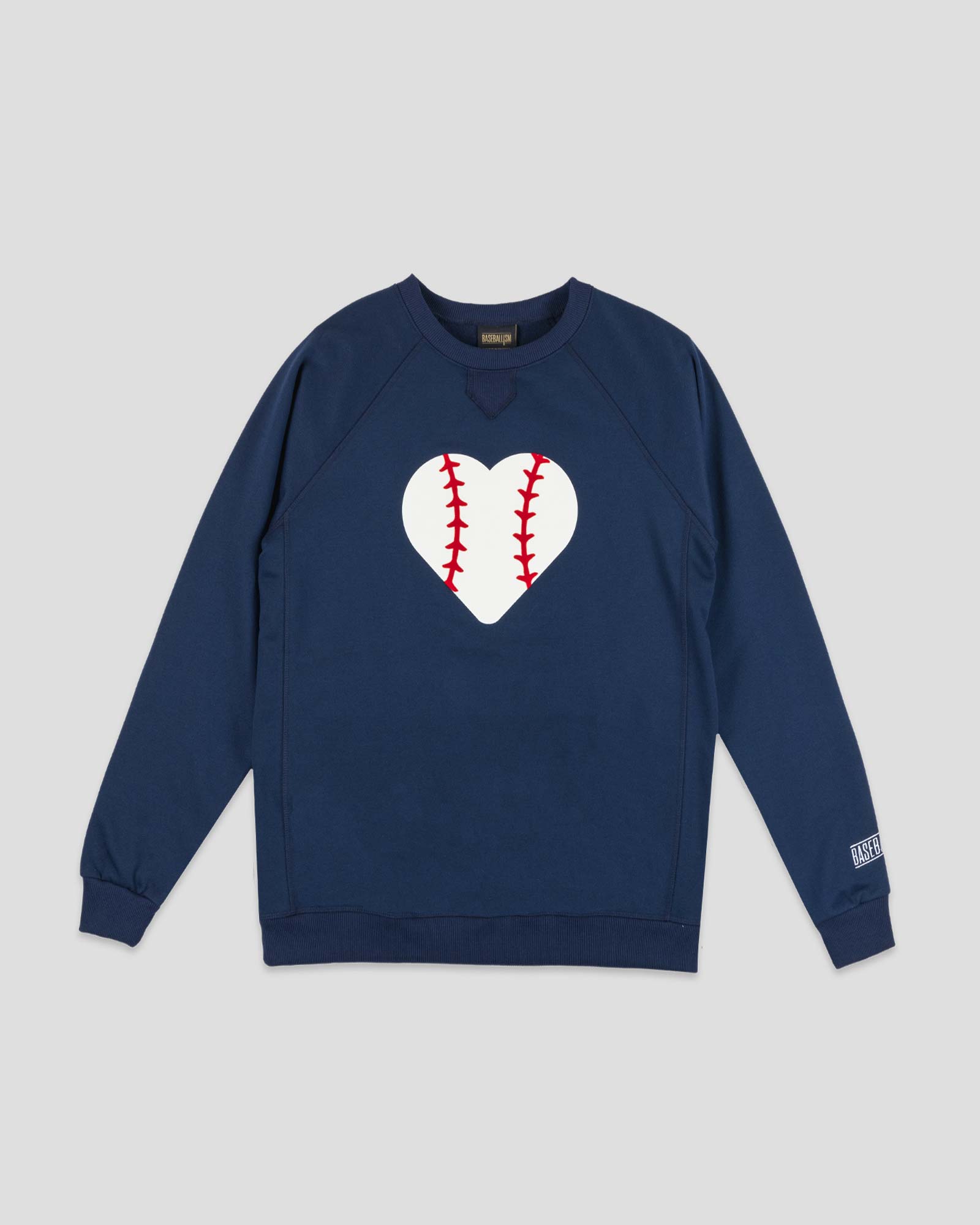 Featuring raised flocked seams screen print for a textured. standout look. this crewneck pays homage to the game with subtle yet meaningful details. The home plate knit rib neckline adds a touch of baseball-inspired flair. while the iconic Baseballism Flag Man embroidery on the sleeve seals the deal.
